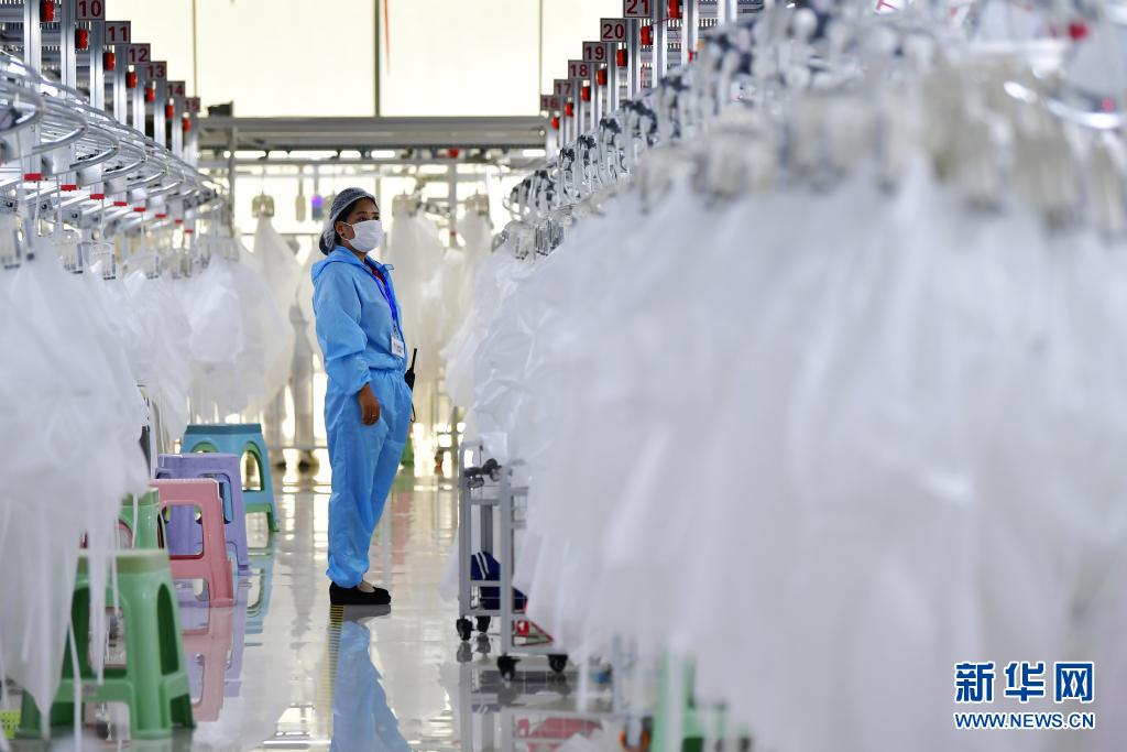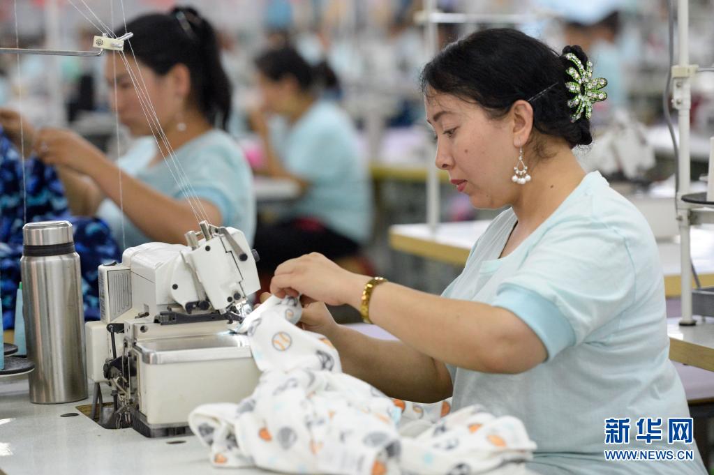 在甘肃临夏回族自治州积石山县,依托东西部扶贫协作平台引进的服装加工企业甘肃拓奇扶贫车间的员工在服装加工生产线上作业(2020年8月9日摄)。新华社记者 陈斌 摄