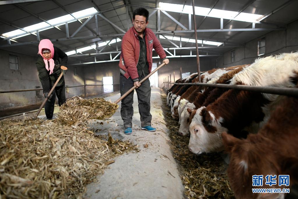 宁夏吴忠市同心县河西镇旱天岭村村民马国才(右)、马婷夫妇在村里的养牛合作社喂牛(2017年12月21日摄)。新华社记者 王鹏 摄