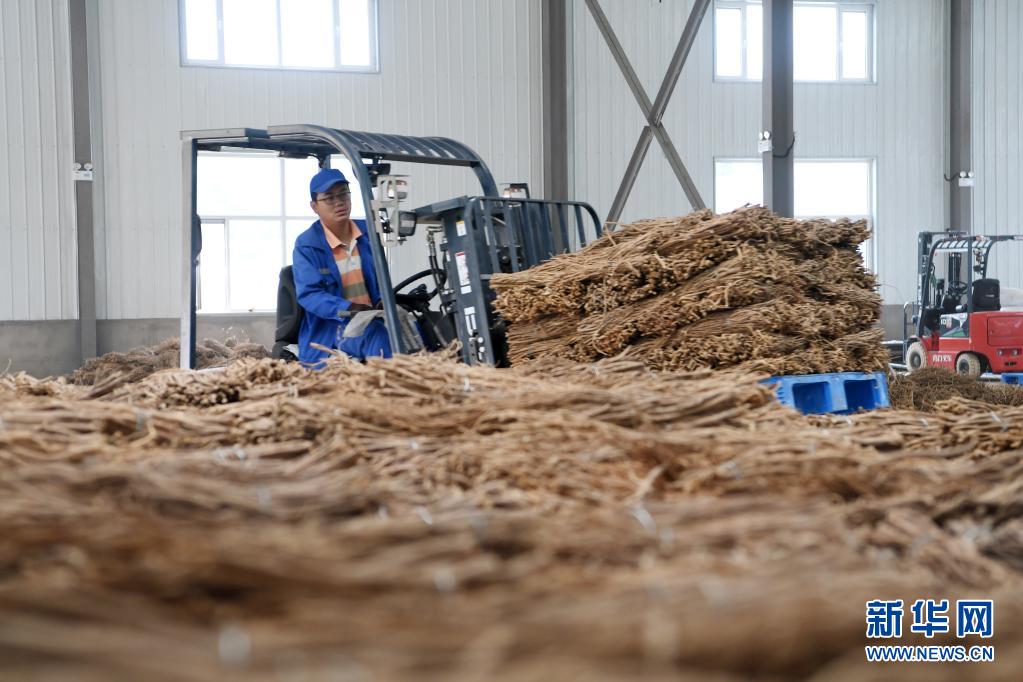 在甘肃省陇南市宕昌县哈达铺琦昆现代中药材仓储物流基地,工作人员使用叉车搬运中药材(2020年9月18日摄)。新华社记者 范培珅 摄