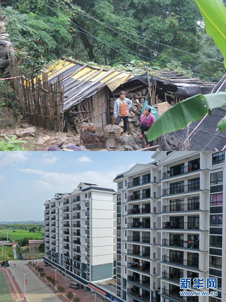 这是一张拼版照片,上图为:2018年11月11日在广西田东县思林镇龙邦村拍摄的村民和自家简陋的房屋(思林镇政府供图);下图为:2019年8月28日拍摄的当地为龙邦村新建的位于田东县思林镇的易地扶贫搬迁安置点(无人机照片,新华社记者曹祎铭摄)。新华社发