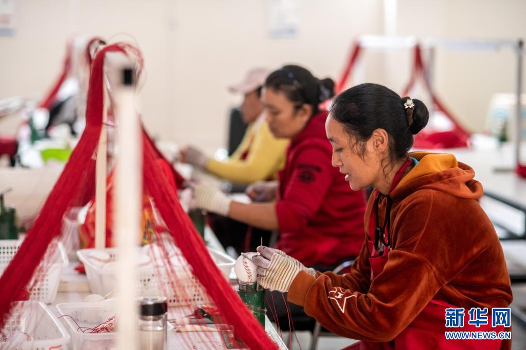 在云南省怒江傈僳族自治州福贡县匹河乡托坪村搬迁安置点,搬迁群众在扶贫车间缝制棒球(2020年11月2日摄)。新华社记者 胡超 摄