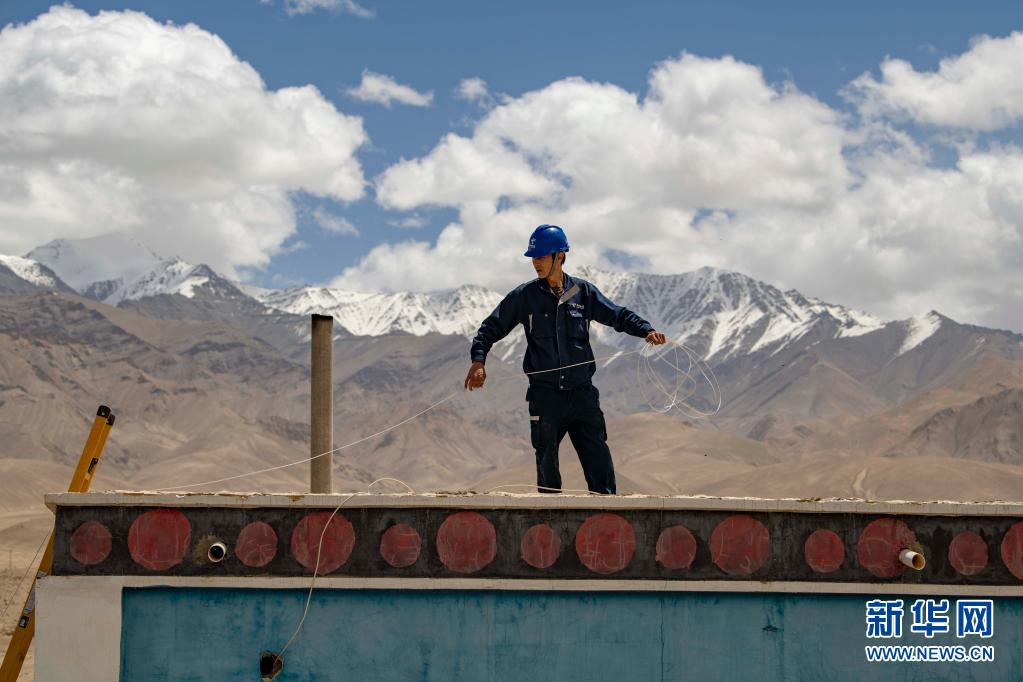 在新疆喀什地区塔什库尔干塔吉克自治县,工作人员为当地农户铺设入户光纤(2020年6月10日摄)。新华社记者 胡虎虎 摄