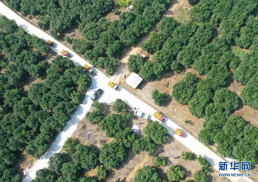 在广西罗城仫佬族自治县金玉柚生态产业扶贫示范区,装载柚子的车辆在柚子园内行驶(2019年11月5日摄,无人机照片)。新华社记者 陆波岸 摄