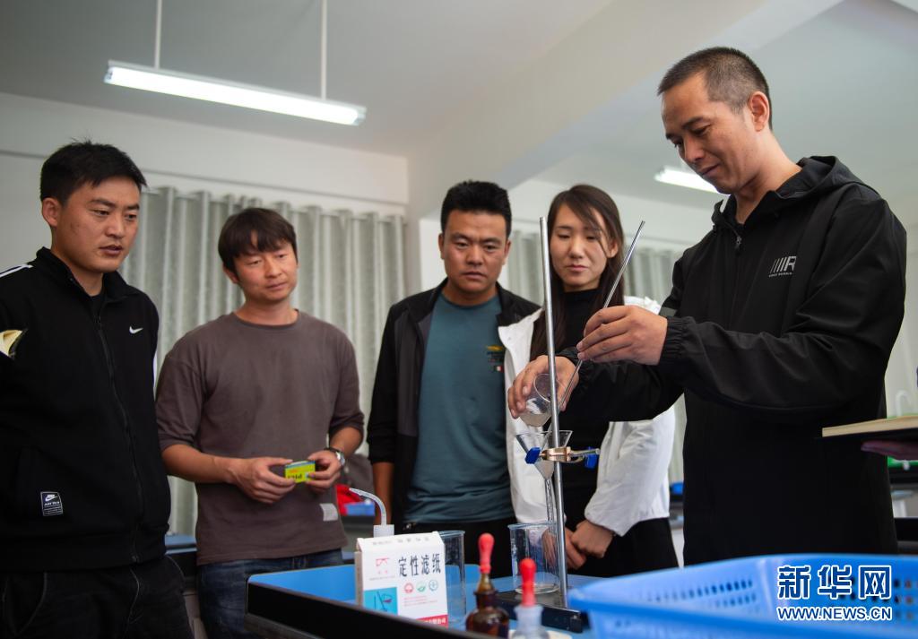 北京市援青支教教师、来自通州区陆辛庄学校的化学教师祁生贵(右一)在青海省玉树州第四民族高级中学指导学校教师进行实验教学(2020年8月12日摄)。新华社记者 陈钟昊 摄