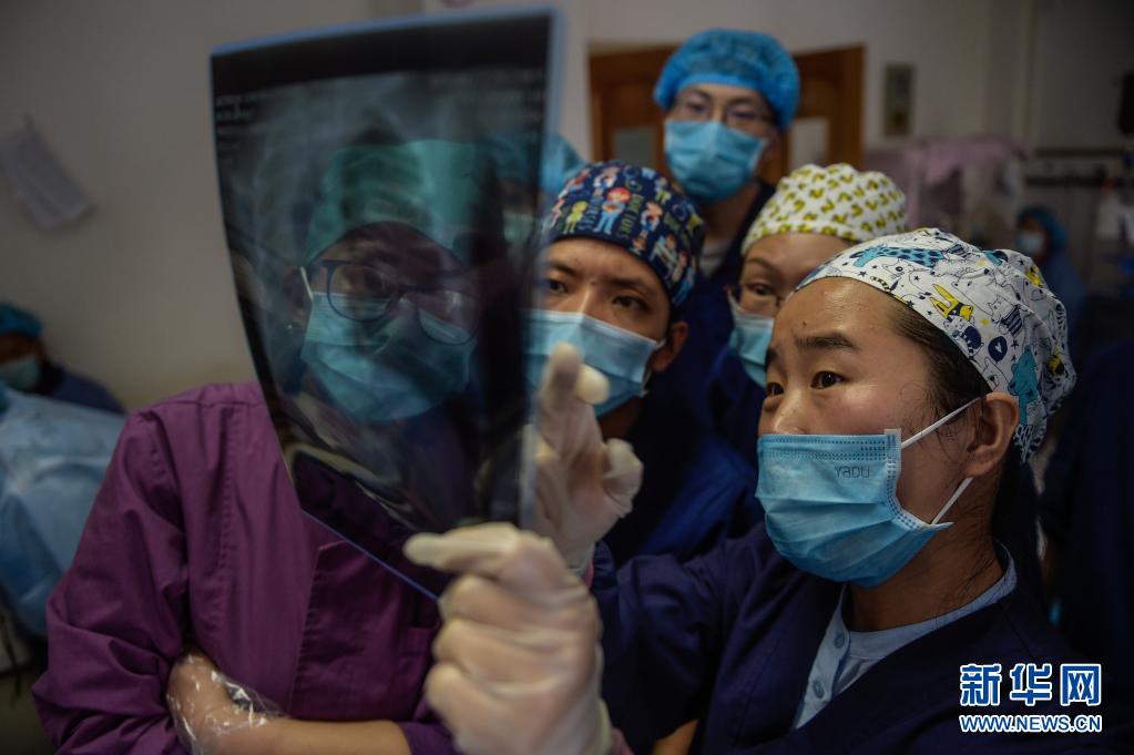 在西藏拉萨市人民医院内,首都儿科研究所的援藏医生韩同英(右一)进行教学查房时,与当地医生们一起研究入院新生儿胸片(2020年8月3日摄)。新华社记者 彭子洋 摄