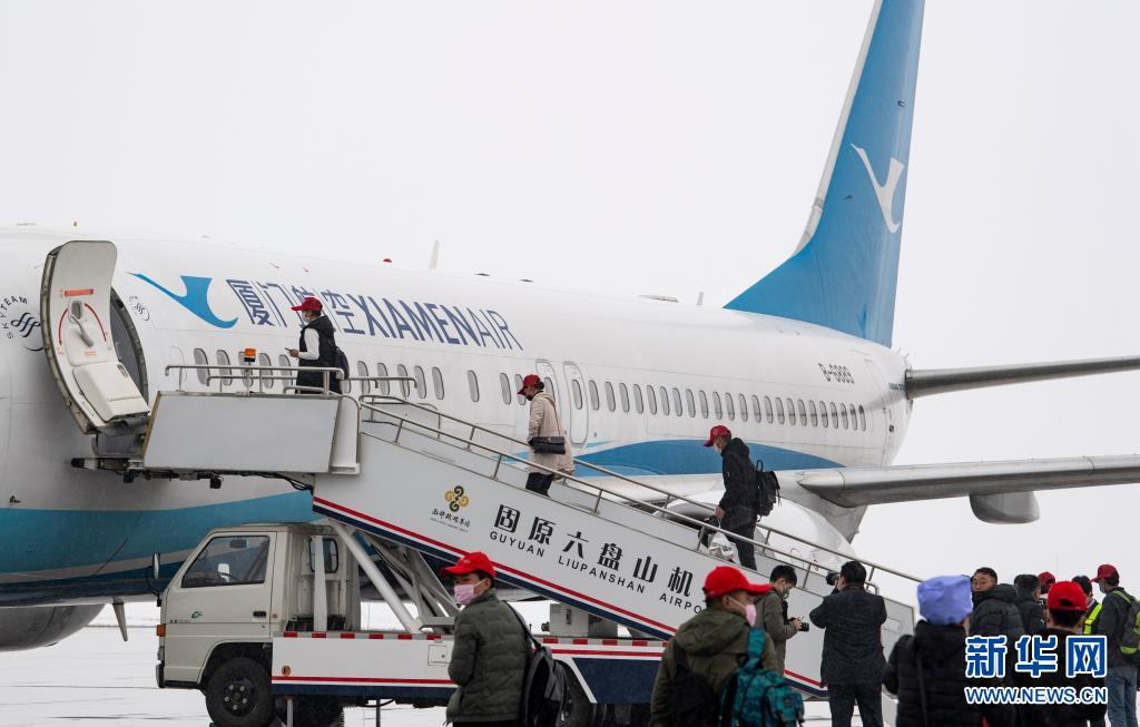 在宁夏固原六盘山机场,固原市原州区、西吉县的务工人员乘包机前往福建(2020年2月27日摄)。新华社记者 冯开华 摄