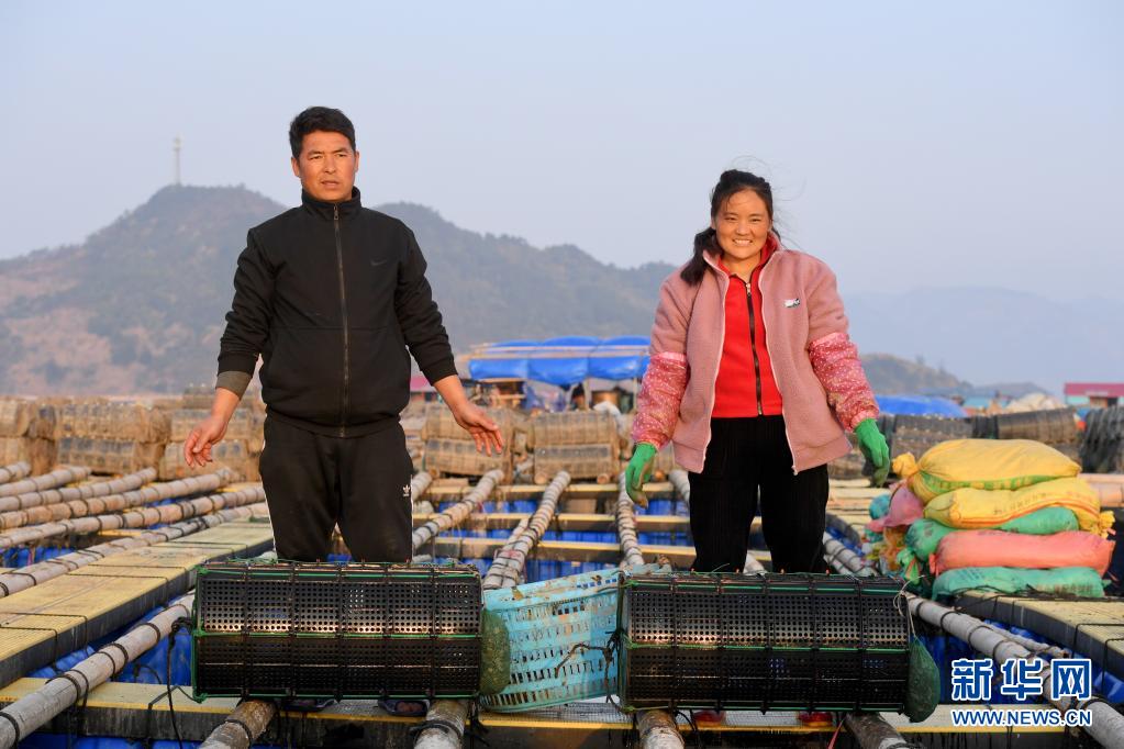 “春运母亲”巴木玉布木与丈夫巫其石且从四川凉山彝族自治州老家辗转来到福建省霞浦县溪南镇海域,从事海上渔排海参养殖。这是2月4日在渔排上拍摄的巴木玉布木(右)与丈夫巫其石且。新华社记者 姜克红 摄