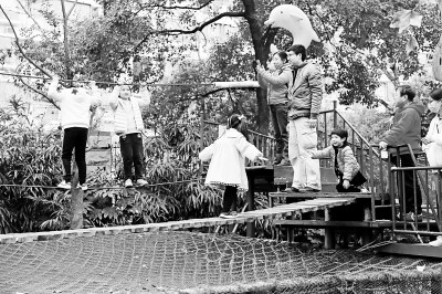上海和平公园内,孩子们在勇敢者乐园里参加体育冒险游戏,感受运动快乐,锻炼身体素质。陈玉宇摄/光明图片