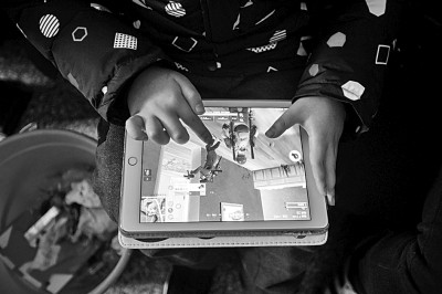 浙江绍兴,一名孩子正在玩平板电脑。许康平摄/光明图片