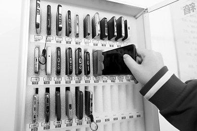 河北工业大学附属红桥中学的学生将手机放入管理箱准备上课。刘东岳摄/光明图片